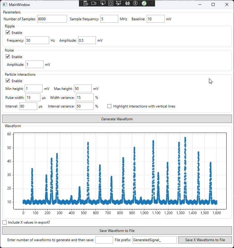 We can simulate the voltage signal quite easily, if we model each particle interaction as a Gaussian pulse (they’re not that far off). Additionally, various kinds of noise can be simulated. The steps might look something like this: