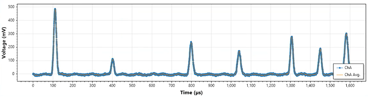 A quick summary of the signal generation process in our instrument: a photodetector outputs an analog voltage proportional to the light it detects (which has been scattered by particles, illuminated by a laser). This analog voltage is captured by an analog-to-digital converter (ADC), which for us is currently a Picoscope 4262. The Picoscope has custom programming libraries allowing us to load the captured signal into arbitrary custom code. This is what the raw voltage signal looks like: