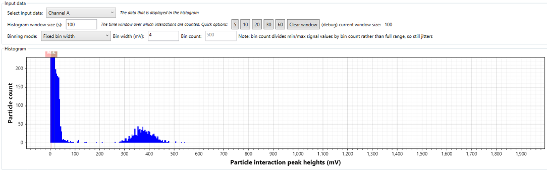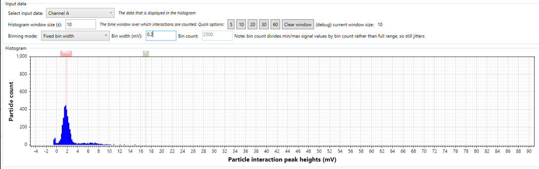 Fig 2: A peak of ~365 mV measured for 1.3 µm PSLs. The high particle count of smaller sizes (~ <50 mV) is likely to be surfactant from the PSL solution
