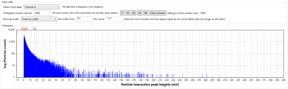When sampling ambient air, outside of the lab environment, the histogram shown below in Figure 3 was generated. Total particle count was approximately 100 particles/ccs⁻¹.